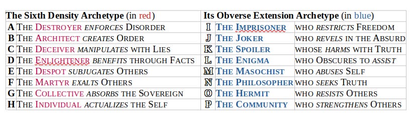 Below are listed the original eight Archetypes of Sixth Density and their corresponding eight obverse Archetypes of the 9th Density (the 18th Dimension).