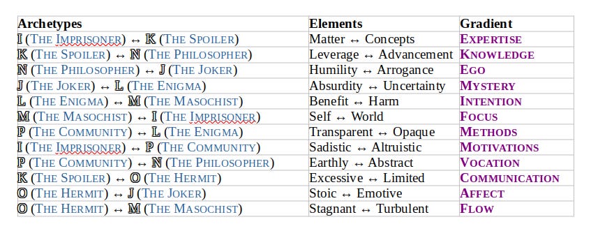 The precise nature of each Gradient varies. For example, the Gradient of Character that connects the Imprisoner and The Spoiler pertains to each Archetype’s Expertise. However, the Gradient that connects The Spoiler and The Philosopher – that is, Knowledge – connects each Archetype’s use of that concept.