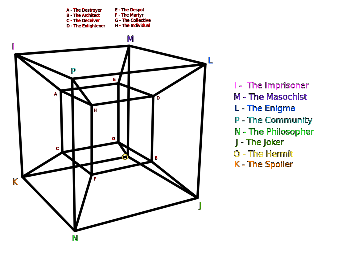 In this article, I’m going to elucidate somewhat the process by which I arrived at this massive conceptual beast, because I am not honestly sure how to even begin to write about it otherwise. It began with the concept of the shape itself, which was, I quickly realized, a tesseract. I later discovered, during the course of my musing scribbles, that the shape need not actually be a tesseract by the technical definition – a tesseract is a cube with cubes for faces, and there is no real reason why our vertices here must form cubes – but the tesseract shape was nevertheless my starting point. After printing out an image – which I have made use of to form the below diagram; I did not make the original tesseract drawing here – I scribbled notes on it until I arrived at what I’m going to share below. It’s far too busy to write every concept on the diagram itself, but stripped down to its component parts, it looks something like this: